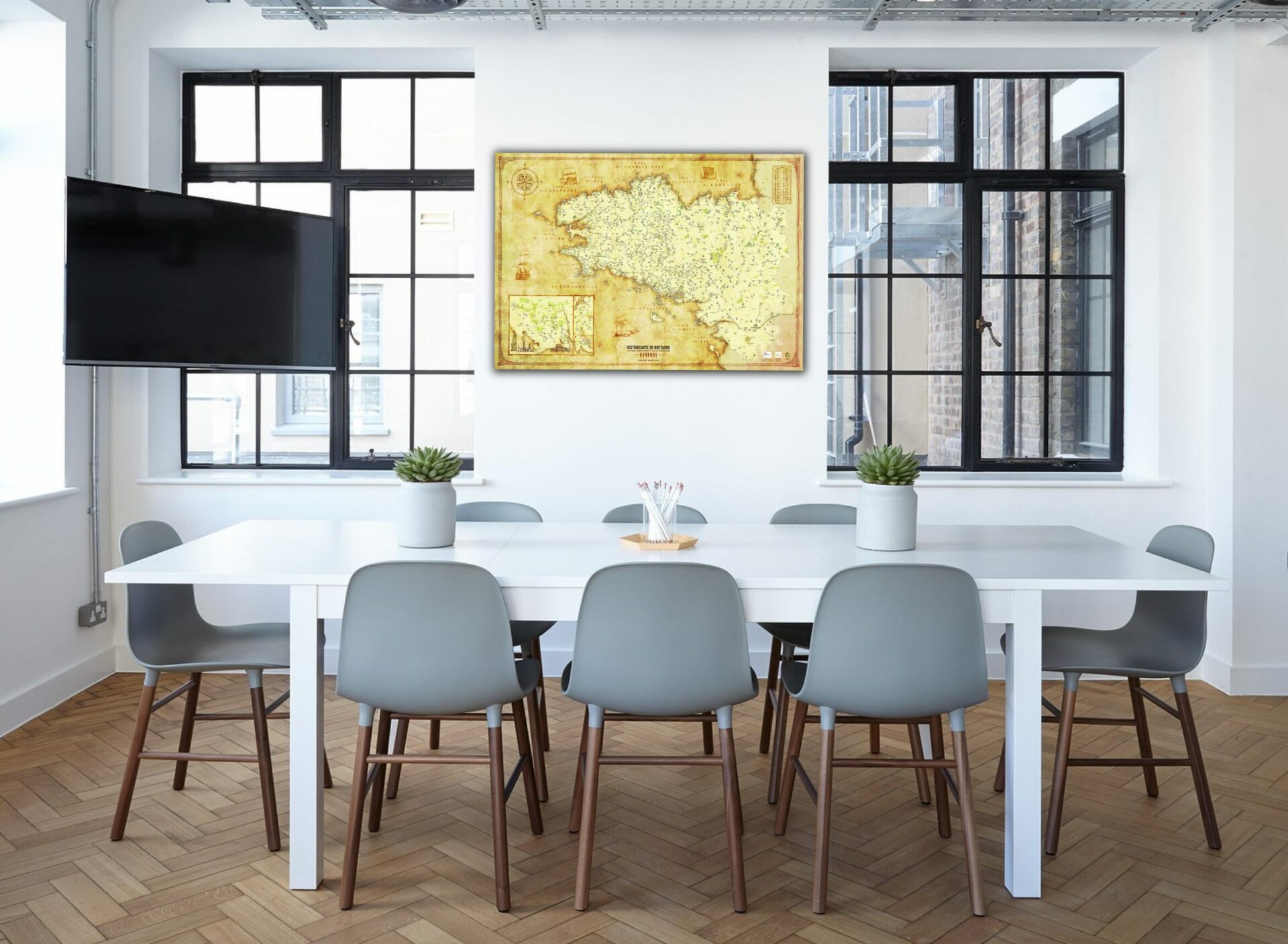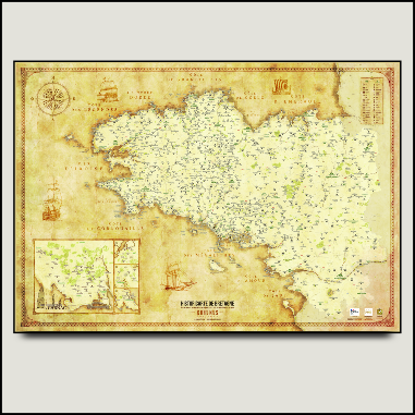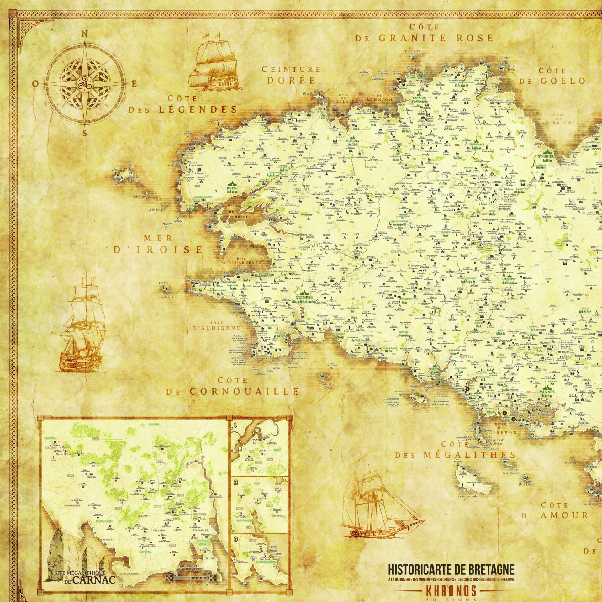 Réalisée par un Maître Cartographe, elle répertorie plus de 1600 sites archéologiques et monuments historiques (mégalithes, patrimoine religieux, châteaux, etc.) répartis sur les cinq départements bretons.
